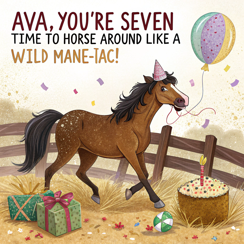 At the top of the image, "Ava, you're SEVEN—time to horse around like a wild mane-iac!"
