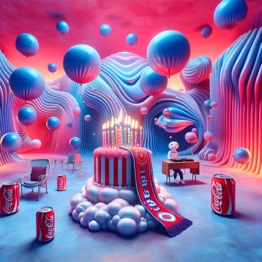 An ethereal, dream-like room expands infinitely, its walls undulating and swaying with vibrant red and blue hues, creating a dynamic backdrop. Floating in the center of the room is a whimsical birthday cake, adorned not with traditional decorations, but with a scarf representative of a renowned football club and vibrant candles burning with peculiar, surreal flame shades. Close to the cake, a whimsical cartoon DJ station, hosted by an anonymous animated football coach, levitates on a cloud, emitting esoteric birthday tunes. Unusually oversized cola cans, forming an offbeat background, serve as eccentric helium balloon sculptures, floating without purpose, contributing to the dreamy, foreign festivity.
