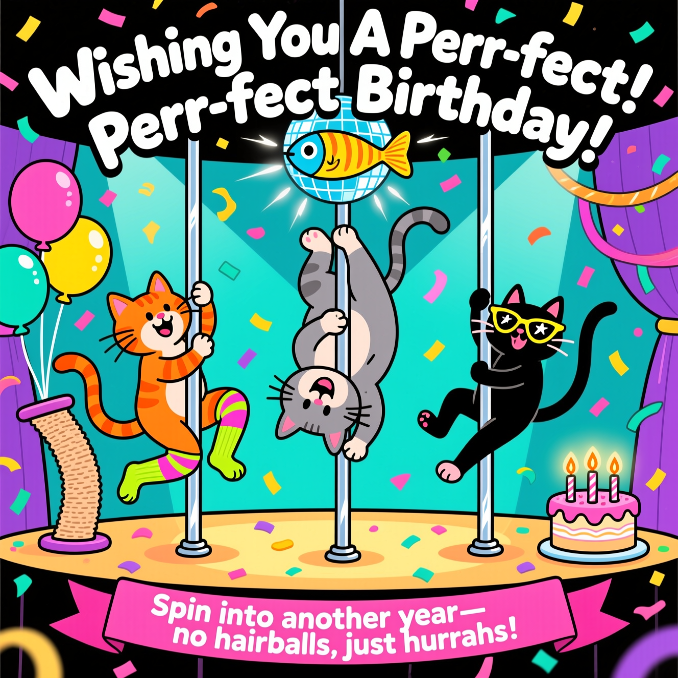 Create a playful, family-friendly cartoon scene: a bright, confetti-filled stage where three goofy cats perform acrobatic pole-dancing routines on shiny chrome poles that resemble oversized scratching posts. One orange tabby in neon leg warmers spins with a wink, a chunky gray cat hangs upside-down hugging the pole with a big grin, and a sleek black cat mid-leap switches poles wearing star-shaped sunglasses. Overhead, a fish-shaped disco ball casts sparkly light beams; balloons, streamers, and a small birthday cake with glowing candles sit off to the side. Use exaggerated proportions, thick black outlines, bold, saturated colors (hot pink, teal, lemon yellow, electric purple), and dynamic motion lines to amplify energy. Keep it cheeky and G-rated—no suggestive clothing. Render the top headline in big, bubbly, high-contrast lettering with a white stroke and drop shadow; arch it slightly. Place the punchline along the bottom on a ribbon banner for clarity, also in bold cartoon type. Ensure clean whitespace around both texts for legibility.