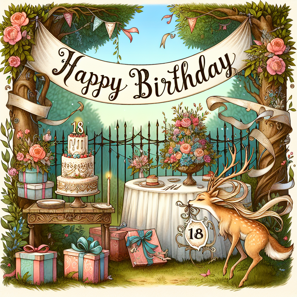 A whimsical drawing with a storybook quality, showcasing a fairy-tale garden with a banner overhead proclaiming '18'. Each area of the garden represents elements of a birthday party, like a table with a cake and presents. In the forefront, a lovely deer holds a sign in its mouth with 'Happy Birthday' written in calligraphic script, directly addressing the daughter's special day.