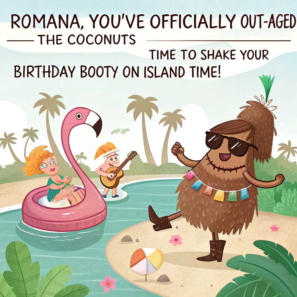 At the top of the image, "Romana, you've officially out-aged the coconuts — time to shake your birthday booty on island time!"