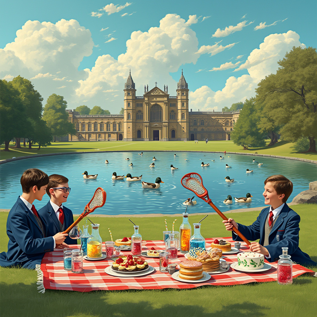 The scene is a whimsical birthday celebration on the sprawling grounds of a fictional Oxford University, set on the shores of a serene, sparkling lake. In the foreground, a humorous lacrosse match unfolds, with players dressed in vintage Oxford-style blazers and ties, some sporting lab goggles as a playful nod to chemistry. Their lacrosse sticks, instead of the usual netted heads, are creatively fashioned to resemble oversized test tubes filled with colorful bubbling potions. Nearby, a small group of ducks on the lake dons tiny mortarboards, adding to the academic charm. The chemistry theme extends further as a jovial professor in a lab coat, holding a lacrosse stick, is seen concocting a fizzy drink with a beaker, while a beaming young student is joyfully serving slices of a birthday cake shaped like the iconic Radcliffe Camera, the famed Oxford library. Above the scene, a sky artistically painted with fluffy clouds spells out "Happy Birthday, Euan!" in wispy tendrils, creating a celebratory banner across the azure expanse. A large picnic spread is laid out on the lush green grass, featuring a book titled "The Chemistry of Cakes" and plates adorned with lacrosse-themed treats. The landscape is richly illustrated with Beardsley-esque intricate linework for the university’s Gothic architecture, and the lake shimmers with Parrish-inspired vibrant hues, all tying together the elements of lacrosse, chemistry, and Oxford University in a delightful birthday tableau.