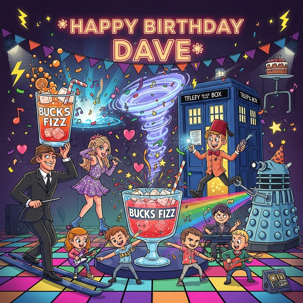 A playful, funny, high-energy cartoon mash-up party bursting with bright saturated colors and thick outlines: a suave secret agent in a tux (James Bond vibe) skids across a neon vinyl-disco floor, winking and balancing a towering Bucks Fizz cocktail that fizzes orange bubbles and glitter. Beside him, a glittering pop diva reminiscent of Kylie Minogue spins on roller skates, mic in hand, hair swooshing, striking a cheeky pose. Behind them, a blue time-travel phone box (Doctor Who TARDIS) stands open, a swirling time-vortex spraying confetti and musical notes while a bow-tied, fez-wearing time traveler pops out with a glowing sonic gadget, mid-dance. On the right, a lovable party Dalek wears a cone hat and carefully holds a slice of cake on its plunger. The Erasure-inspired duo jam on neon synths and a keytar, shooting rainbow light beams across the scene. Center stage, an oversized Bucks Fizz glass doubles as a mini stage where a cartoon quartet do synchronized kicks, confetti bursting from the rim in sparkling starbursts. Add bouncing musical notes, lightning bolts, heart-shaped bubbles, and disco spotlights everywhere. Exaggerated proportions, big expressive faces, energetic poses, glossy highlights, and a joyful, comedic vibe throughout.