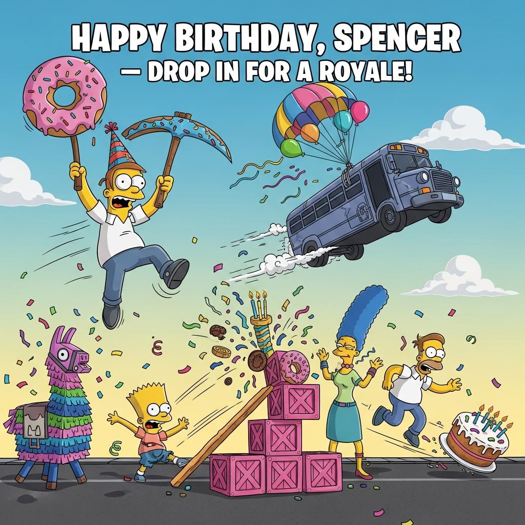 A funny, high-energy Fortnite–Simpsons mashup in bright, saturated colors with thick black outlines and exaggerated, bouncy proportions: a yellow-skinned, big-eyed, overbite “Simpsonized” Spencer wearing a party hat lands from the Battle Bus mid-emote, swinging a pickaxe shaped like a giant frosted donut. Overhead, the Battle Bus floats with rainbow party balloons and a pink-donut parachute trailing streamers. Below, a goofy loot llama piñata bursts into confetti, chocolate-coin loot, and birthday candles; a spiky-haired kid frantically builds a wobbly ramp from pink donut crates while a tall blue-haired mom figure boogie-bomb dances. A donut-loving dad chases a runaway supply-drop birthday cake rolling down the street. Motion lines, comic swirls, confetti, and starbursts amplify the chaos; palette of canary yellows, bubblegum pinks, electric blues, and lime greens. Wide, dynamic composition with whimsical, energetic poses; bright midday lighting and crisp shadows. Place the headline in a big bubbly cartoon font with a thick white stroke and soft blue shadow; no additional text or UI elements anywhere else.