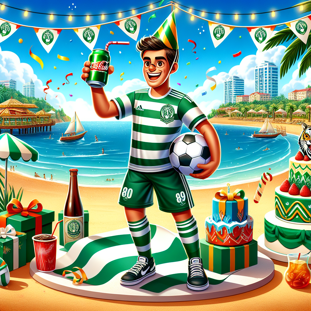 A delightful celebration illustration showcasing a festive setting which includes elements inspired by a football club, distinguished by a green and white striped uniform and the club emblem, decorating the surroundings. At the heart of the composition, a character outfitted in the team's gear is cheerfully raising a generic soda can to signify the birthday celebration. The backdrop portrays a scenic depiction of a popular vacation city, characterized by sunny beach landscapes and high-rise hotels, contributing to the summer holiday atmosphere.
