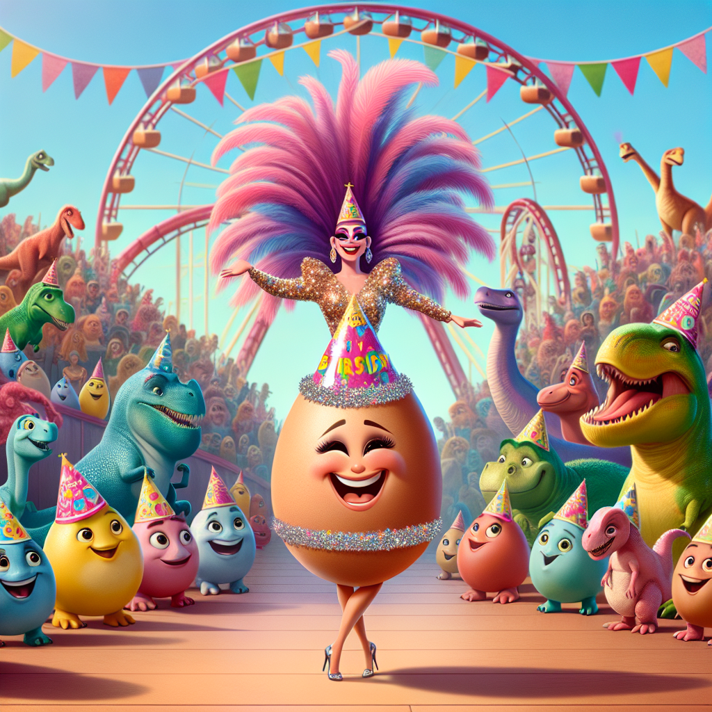 Create a charming birthday-themed illustration featuring a smiling egg wearing a mini birthday hat at the center of attention. In the background, display a collection of friendly dinosaurs, differing in body forms and sizes, eagerly lining up for a thrilling ride on a vibrantly colored rollercoaster. Towards the center of the scene, depict a flamboyant drag queen of Hispanic descent, adorned in a feather and sequin-filled attire, imposingly standing tall amongst the group of dinosaurs, striking an extravagant celebratory pose to rejoice at the birthday festivity.