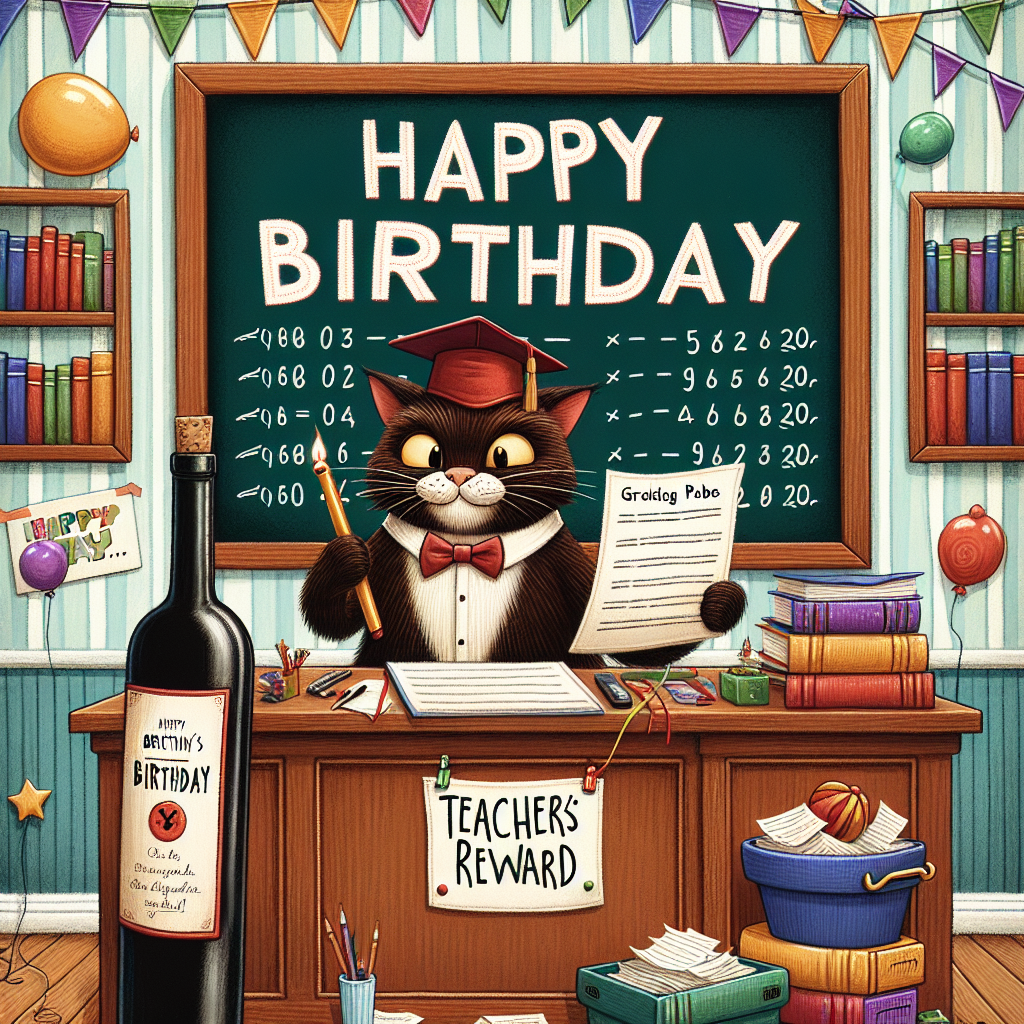 Create an illustration with a birthday theme that showcases a playful scene in a classroom. At the center, position a mischievous brown-black cat, who is wearing a graduation cap and is seated on a pile of books, judging papers with a cheeky expression. Near the cat, place a wine bottle desk with a label reading 'The Teacher's Reward.' The background should give a festive-party feel to the classroom, with decorations of streamers and balloons. Lastly, the words 'Happy Birthday' should be written on a blackboard in the backdrop.