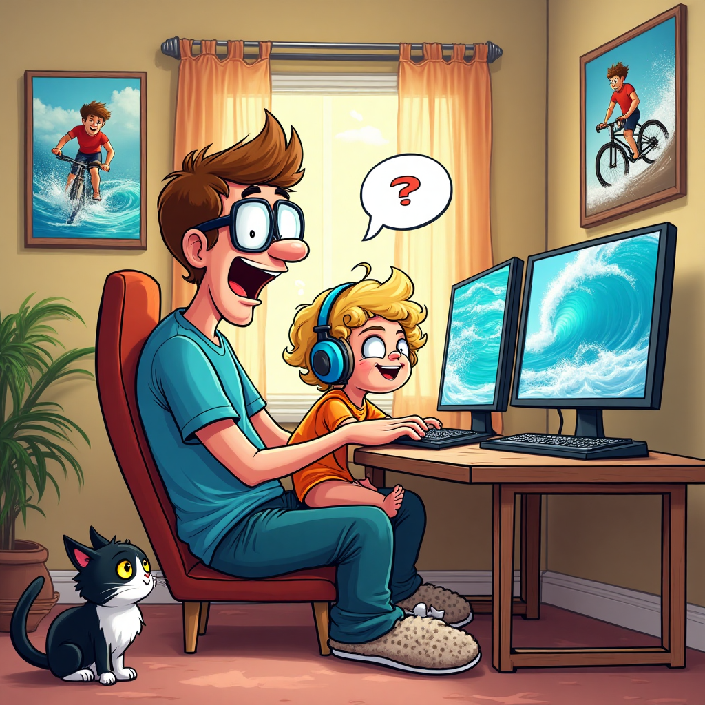 Imagine a vibrant cartoon scene: a 36-year-old man with comically oversized glasses and cozy slippers is enthusiastically coding on a set of multiple, slightly askew computer screens. Seated on his lap is a cheerful baby girl with short, fluffy blonde hair, donning a pair of comically large headphones that almost cover her entire head, grinning from ear to ear. A curious black and white cat, with exaggeratedly big eyes, watches the scene intently, its tail curling into a question mark shape.