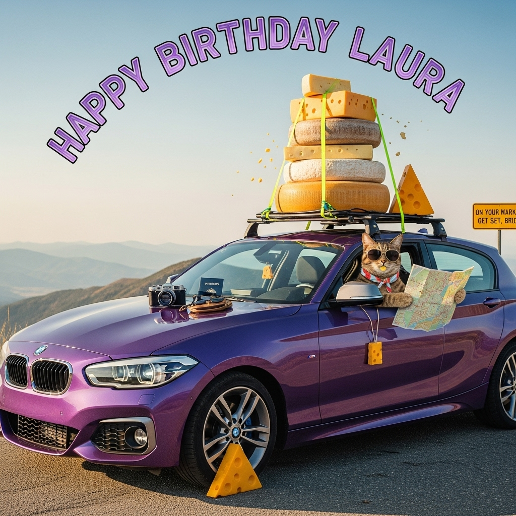 Cheese , Purple BMW 120i, Tabby cat , Travelling , , and Birthday Card
