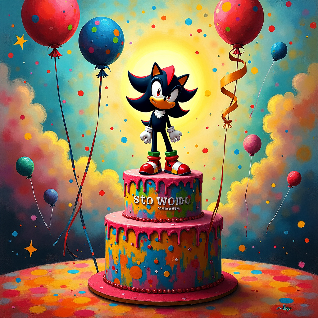 Picture a whimsical world where Shadow the Hedgehog celebrates a birthday in a vibrant, abstract dreamscape. The backdrop is a riotous canvas of color, echoing the bold strokes of Kandinsky with geometric shapes reminiscent of Mondrian's grids. Shadow stands center stage, striking a dynamic pose atop a colossal, three-tiered birthday cake. This cake is a kaleidoscope of Pollock-style splatters, with frosting colors that swirl in a Rothko-like haze. Suspended above him, de Kooning-esque balloons float in mid-air, their erratic forms outlined with a hint of Malevich's Suprematism. The sky is a canvas of layered Miró-like stars and cloud forms, where Ally's name is playfully integrated. Written in Cy Twombly's scribble style, "Happy Birthday Ally" spirals across the sky, as if being whipped by the wind. To the left, a surreal landscape unfolds with Richter-like smears and Martin-inspired gridlines, where shadows and light play tricks on the eye, just like Shadow the Hedgehog's quick-footed antics. The entire scene is an abstract ballet of color and form, capturing a unique birthday moment in an artist's palette of surprise.