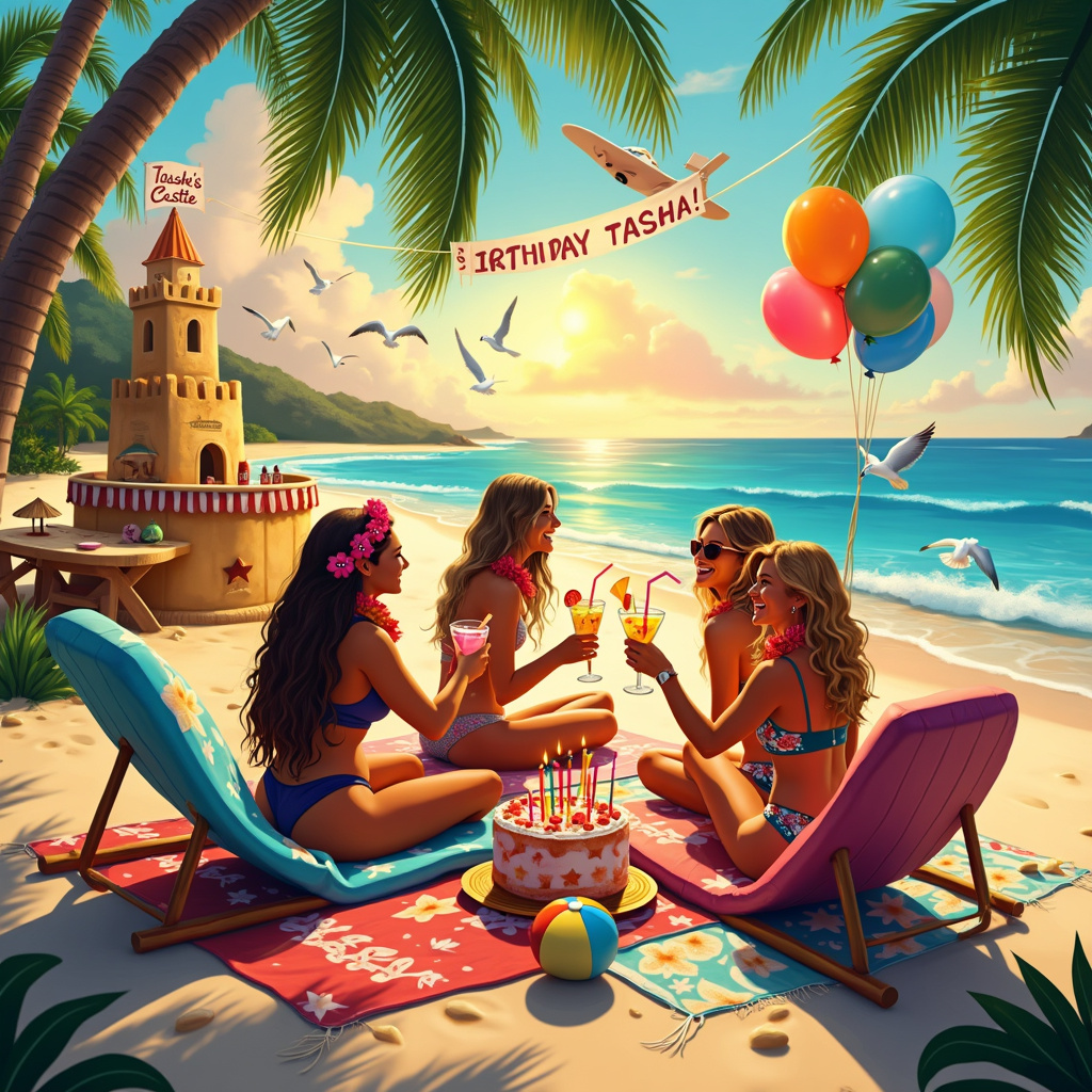 Behind them, palm trees sway gently in the warm breeze, their leaves framing the scene perfectly. In the sky, trailing from a banner pulled by a small, cheerful plane, the message "Happy Birthday Tasha!" flutters playfully. A beach ball adorned with a bright smiley face bounces nearby, having just been tossed by one of the friends.