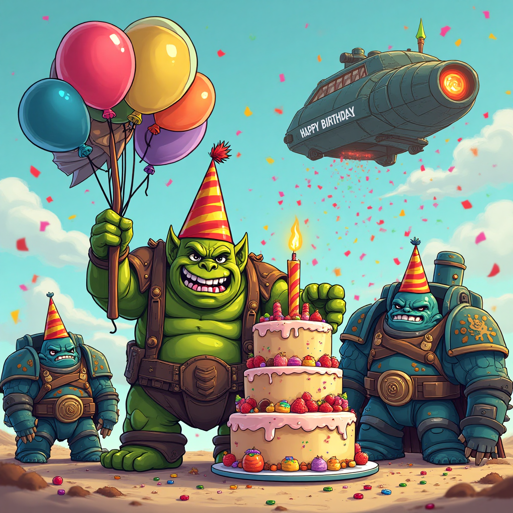 Create a vibrant and playful cartoon scene set in a whimsical Warhammer universe. Imagine a pint-sized, friendly orc with an oversized birthday hat, waving a miniature battle axe festooned with balloons. Around him, a group of chubby, joyful space marines are holding a birthday cake made of alien treats, each layer bursting with color and whimsy. In the background, a cheerful tank is wearing a party hat and blowing a noise maker, while confetti rains down from a hovering spaceship with "Party Mode Activated" flashing on its side. The whole scene is bathed in bright, saturated colors, with thick, exaggerated outlines, capturing a sense of fun and energy.
