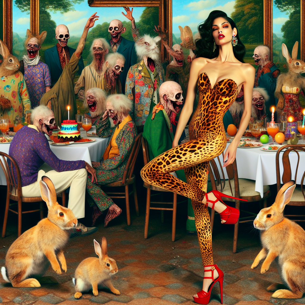 Create a surreal and captivating image featuring an intriguing scene. Central to the depiction is a sultry female model of Hispanic descent, she is wearing a vibrant leopard print outfit asserting a playful yet alluring vibe. The backdrop to this scene is a peculiar birthday celebration, with a gathering of strangely interesting zombies interacting amidst the celebration. The model's feet are graced with striking red high heels, contributing to the scene with a bold color splash and elegance. Amidst this strange chaos, unusual oversized rabbits that can stand and move like humans are hopping around, contributing to the eccentric charm of the weirdly delightful birthday party.