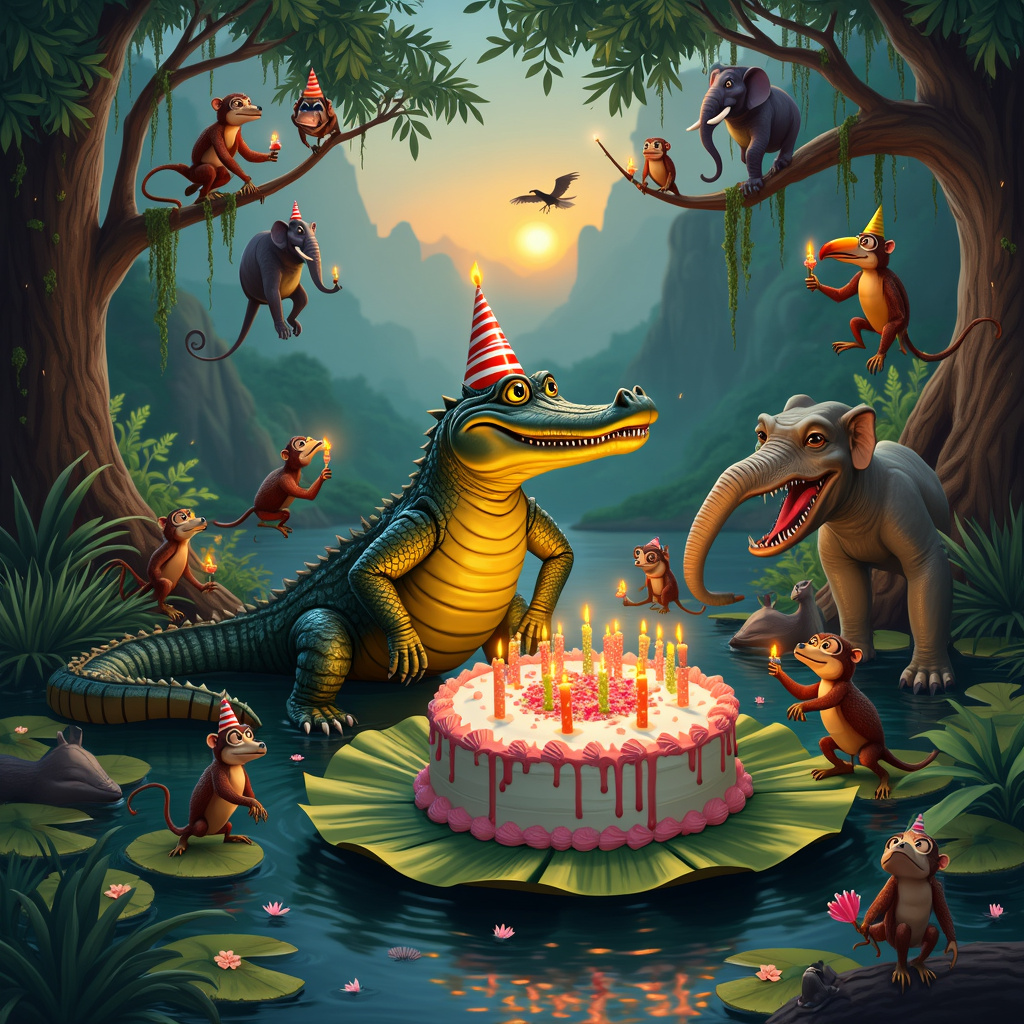 Around the cake, a few baby crocs are seen, playfully snapping at the air, some with candles clutched in their little jaws. On a nearby riverbank, an elephant stands, holding a candle with its trunk, gently blowing on it to make it flicker. Nearby, a parrot with vibrant feathers squawks joyfully from its perch on a decorated tree branch, which is wrapped in vines that have small, twinkling lights interspersed among them.