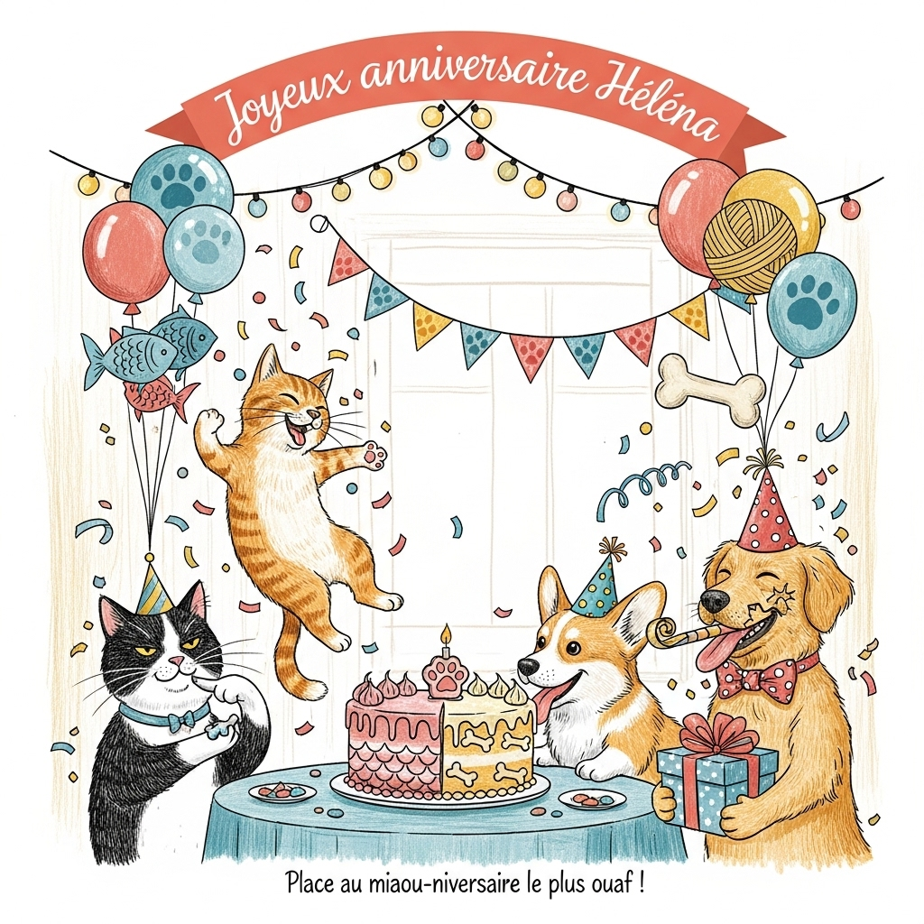 At the bottom, add a small cheeky caption in a neat handwritten script: Place au miaou-niversaire le plus ouaf!