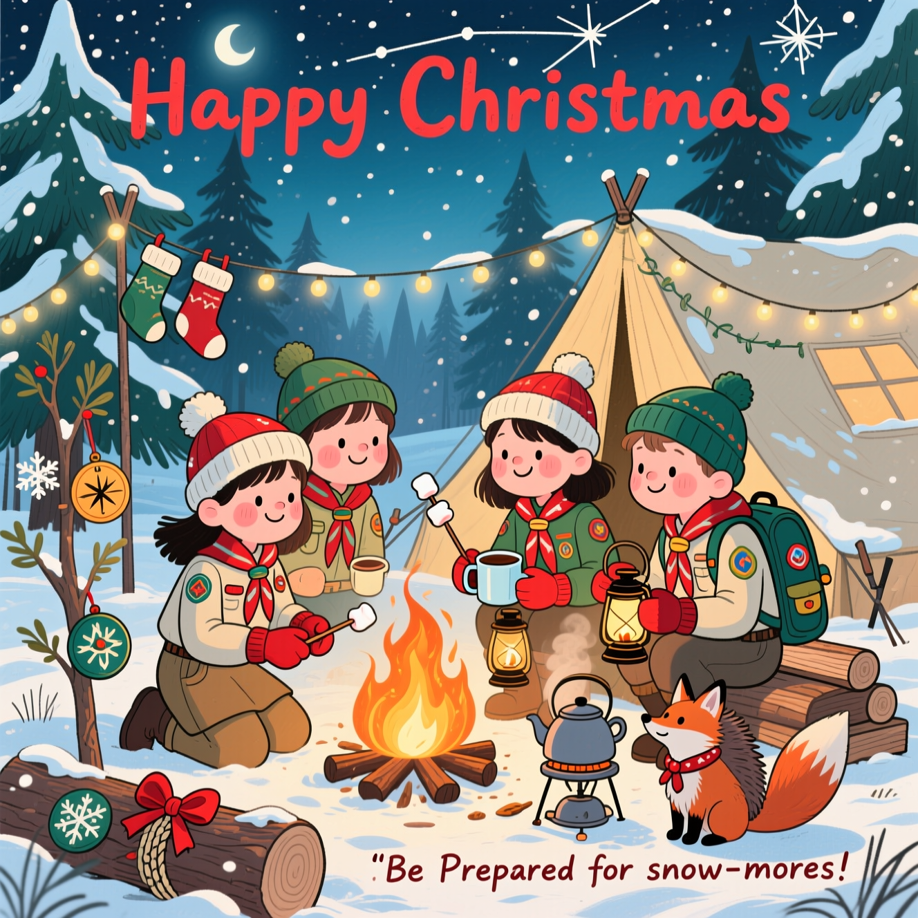 Cute Christmas, hand-drawn illustration with fine linework and textured brush strokes, balanced composition, warm expressive palette (firelight amber, cranberry red, juniper green, snowy cream, twilight teal). A snowy pine-forest campsite at dusk: a glowing campfire at center, ringed by cheerful Scouts/Girl Guides in cozy winter uniforms and neckerchiefs, rosy cheeks, woolly hats and mittens, roasting marshmallows and sipping cocoa from enamel mugs. Behind them, snow-dusted canvas tents; twinkling fairy lights strung between trekking poles; stockings hung from the tent guy lines; a kettle gently steaming on a compact camp stove. One scout kneels by a neat knot board, tying a festive red bowline; another holds a lantern; a third stacks wood with a little badge-covered backpack nearby. A small friendly fox (or hedgehog) in a tiny neckerchief peeks from behind a log. A sapling is decorated with handmade badge-shaped ornaments (snowflake, compass, campfire). Gentle snowfall, long soft shadows, warm firelight on smiling faces, cool moonlit blues in the background, and a subtle compass-rose constellation in the starry sky.