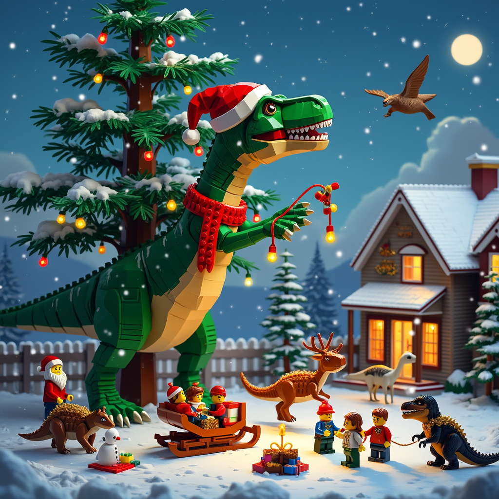 This whimsical and detailed scene captures a fantastical Christmas world where dinosaurs and Lego figures come together to celebrate the holiday season in the most imaginative way possible.