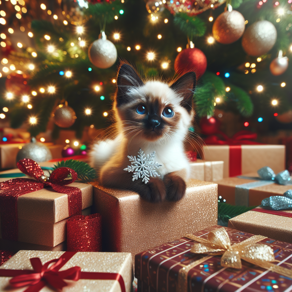A playful slender Siamese kitten, featuring a rich seal point coat and deep blue eyes, sits amidst a pile of gift-wrapped boxes under a lavishly decorated Christmas tree, a delicate snowflake resting on its nose.