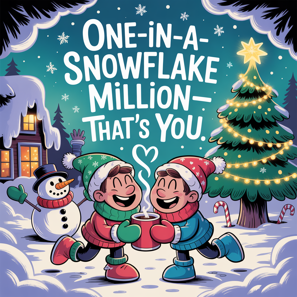Text on image (large, single line, hand-lettered across the sky): “One-in-a-snowflake million—that’s you.”
