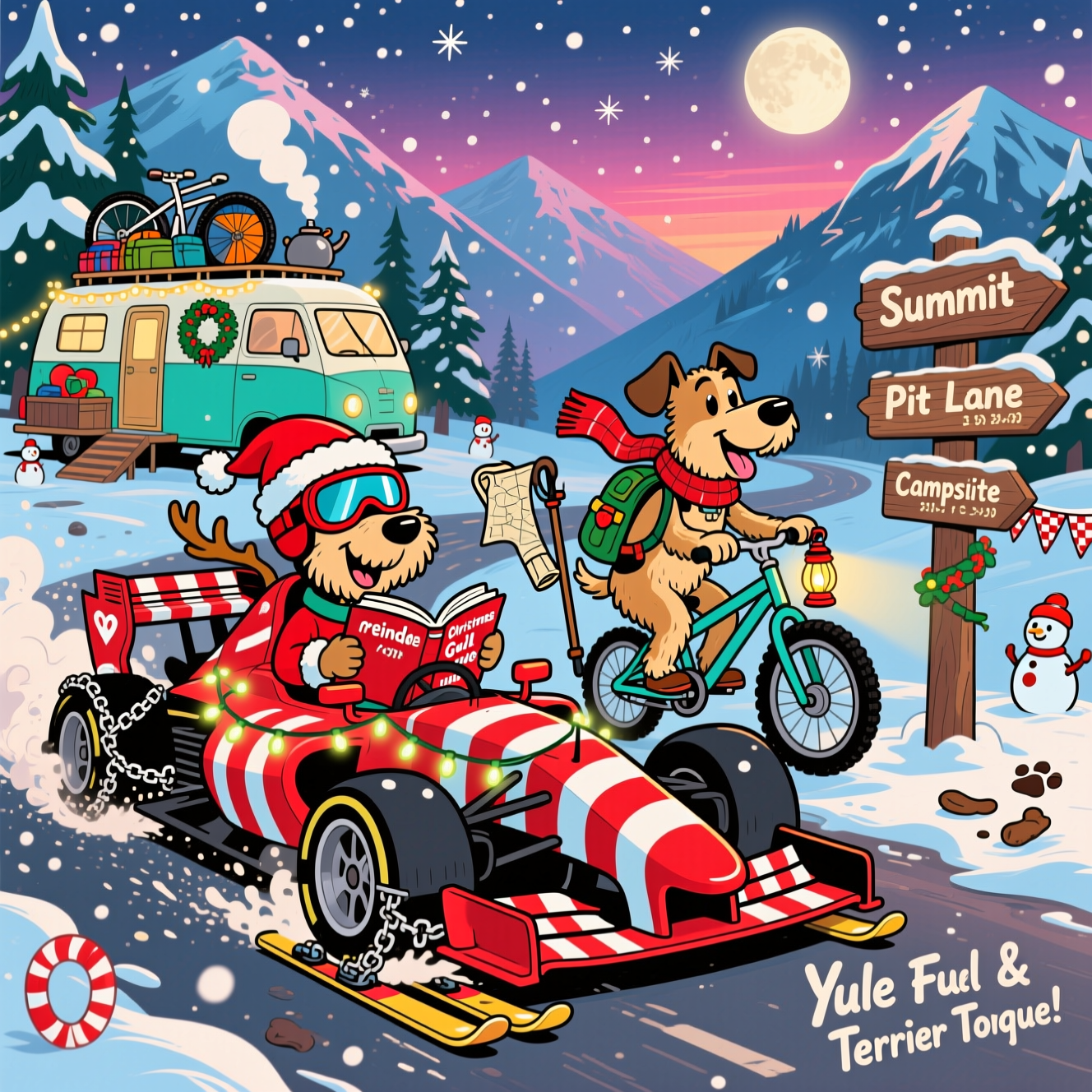 Midground left: A cozy retro campervan (mint and cream) parked under snow-laden pines, decked in twinkly lights and a wreath; roof rack piled with gear and a spare MTB; steam puffing heart-shaped from a kettle. Midground right: a wooden trail signpost reading “Summit,” “Pit Lane,” and “Campsite” with distances; mixed pawprints and bootprints winding uphill. Festive extras: candy-cane kerbs like a racetrack, checkered-flag bunting, tiny snowmen in pit-crew headsets.