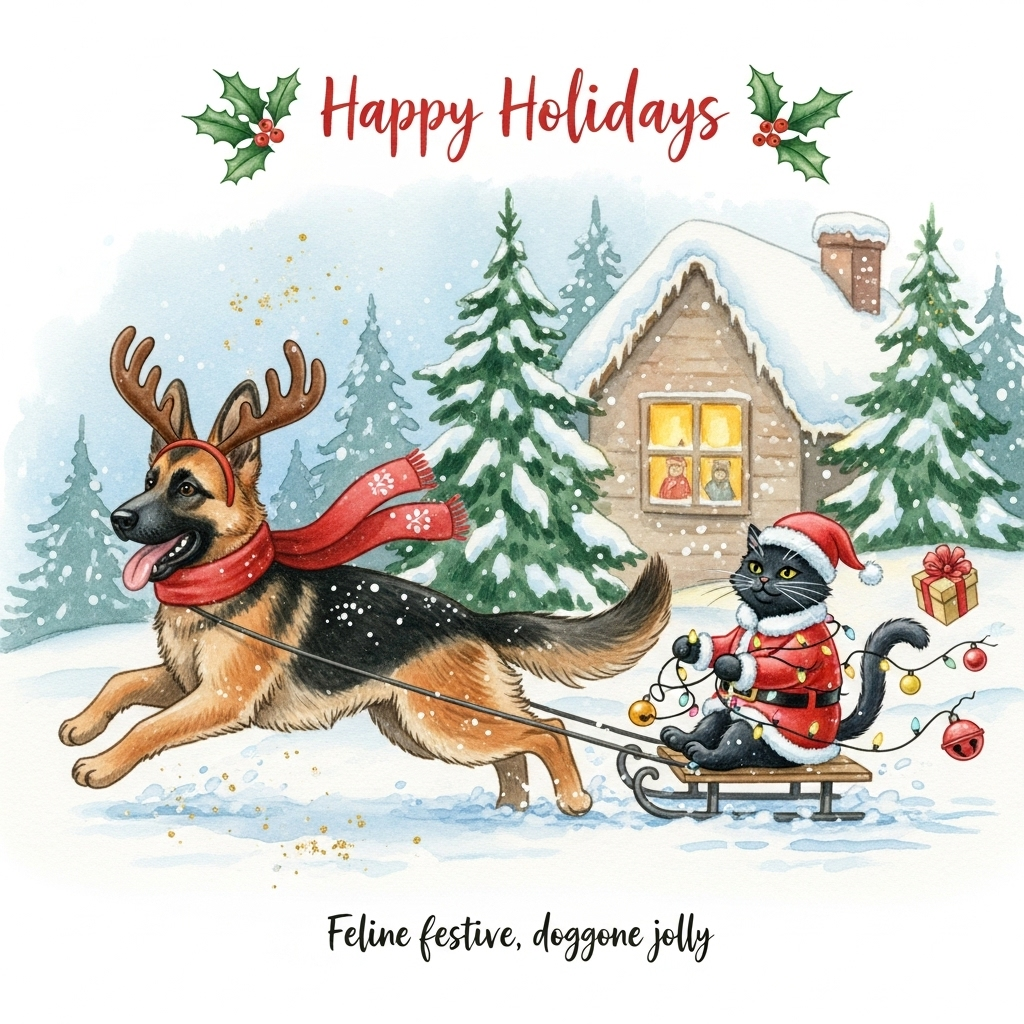 A funny Christmas watercolor scene with soft washes and delicate gradients: a cheerful German Shepherd wearing plush reindeer antlers and a chunky red scarf bounds through powdery snow, pulling a tiny sled that carries a smug black cat dressed as Santa. The cat—inky jet-black with cool indigo highlights—“steers” using a tangled string of fairy lights as reins, one paw lazily flicking a dangling bauble while a gift box bounces off the sled mid-air. The German Shepherd’s tongue lolls with giddy joy, little jingle bells and tinsel shimmering as they bounce. Keep the background loose and airy: pine trees, warm cottage window glows, and soft snow drifts suggested with negative space so the duo is large and central.