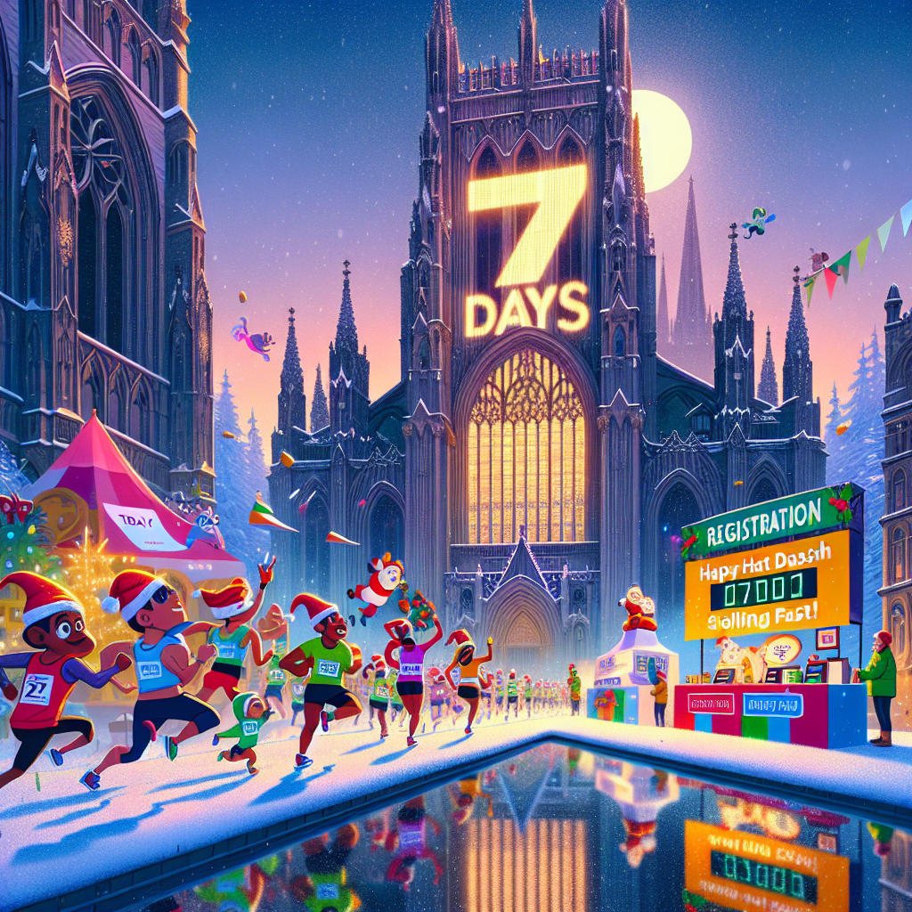 At twilight, the Lichfield Cathedral towers over the animated 'Santa Hat Dash'. Vibrant cartoons dash along the Minster Pool's edge, where '7 days to go' is projected in giant letters on the side of the cathedral. 'Happy Hat Dash' banners wave amid the snowy scene, with a bustling registration area flagged 'SELLING FAST!'. A part of the course includes a 'Kindness Corner' where runners donate to the FoodBank, and a relay team includes a member with a disability, emphasizing inclusivity and community spirit.