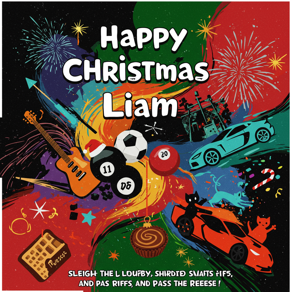 Typography: “Happy Christmas Liam” in bold, hand-painted brush lettering, off-white with a soft glow and slight arc at the top. At the bottom, a tiny cheeky caption in clean sans serif: “Sleigh the lobby, shred the riffs, and pass the Reeses.” Bright, glossy highlights and subtle glow on key shapes; textured canvas feel, full-bleed.