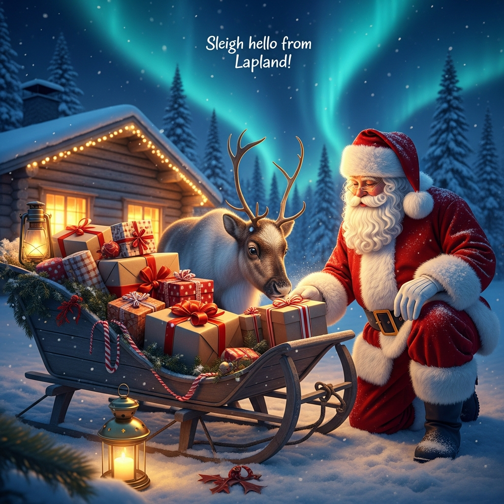 Text on image (single short, cheeky line): “Sleigh hello from Lapland!”