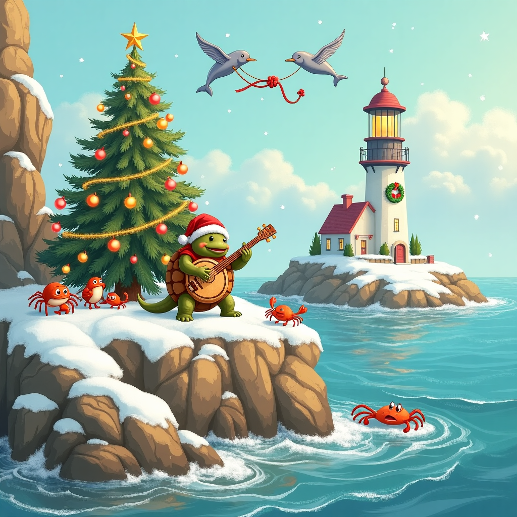 On the front cover of the Christmas greeting card, imagine a whimsical, bustling scene set on a rugged, rocky seashore that's delightfully adorned in festive Christmas themes. The rocky terrain is a series of jagged cliffs and smooth boulders that extend into a sparkling azure sea, their surfaces dusted with freshly fallen snow that glistens under the pale winter sun. Atop the largest boulder, a joyful gathering of anthropomorphic sea creatures is in full swing, each donned in playful holiday attire. A wise old turtle, with a Santa hat perched askew on its head, leads the assembly. It's strumming a banjo with a shell-like resonance, while a school of tiny fish dance in synchronized movements around its feet.