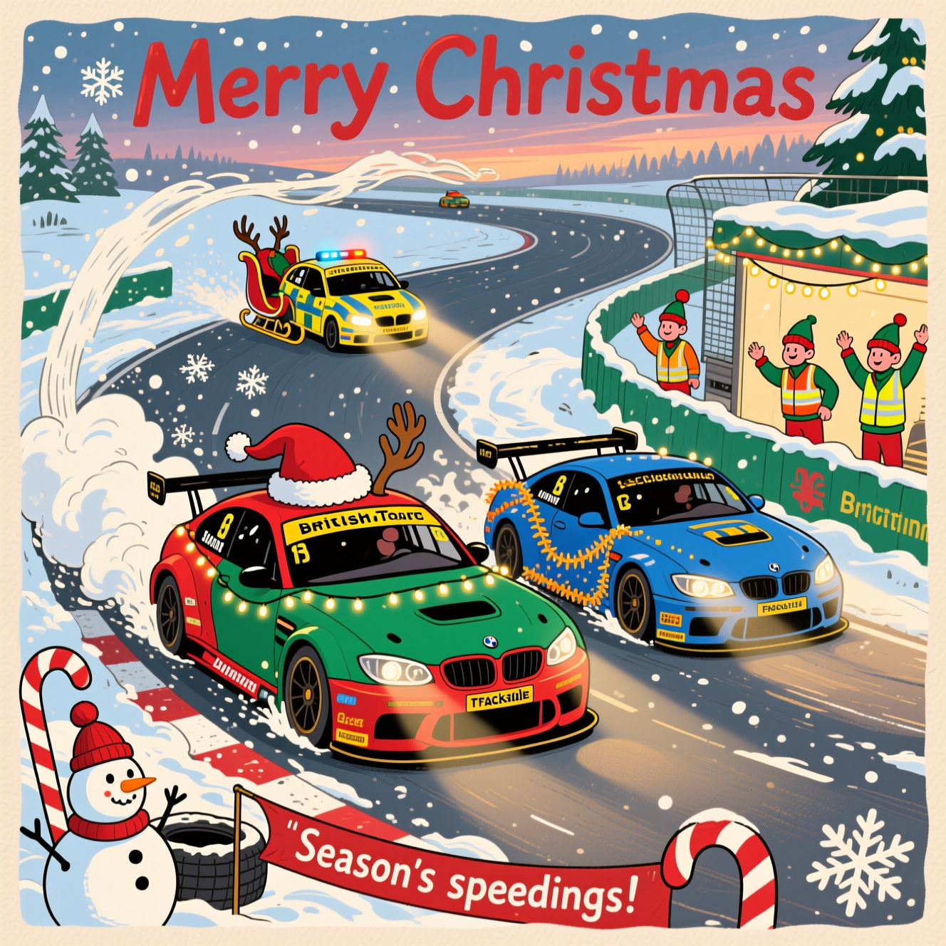 A funny, hand-drawn illustration of a British Touring Car Championship–inspired winter race scene: chunky, box-arched touring cars power-sliding through a snow-dusted British circuit hairpin. One red car wears a floppy Santa hat on the roof; a green one has reindeer antlers and a string of fairy lights twinkling across the grille; a blue one trails tinsel from the rear wing. The safety car out front is whimsically styled like a sleigh with flashing fairy lights. Candy-cane kerbs, tyre-barrier snowmen, and pit-crew “elves” in hi-vis bobble hats cheer from the pit wall. Exaggerated motion lines and rooster-tails of powdered snow curl into snowflake shapes behind the cars. Warm, expressive winter palette (creamy snow, pine greens, festive reds, twilight blues, golden highlights), fine linework, and textured brush strokes on softly grained paper. Balanced composition with the sweeping track leading the eye, falling snow, glowing headlights, and cosy dusk sky. No brand logos or legible car numbers.