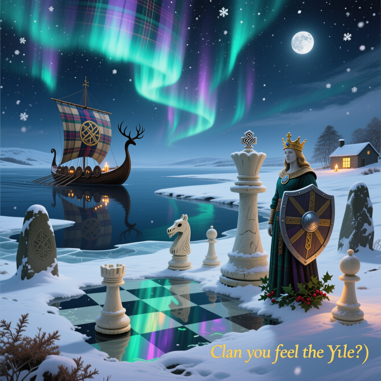 A heartfelt, dreamlike surreal winter night on the Isle of Lewis under a cathedral of Northern Lights that unravel into flowing tartan ribbons. The landscape warps into a chessboard shoreline of ice and mirrored lochs; squares bend and melt like soft wax. Monumental Lewis chessmen—solemn king and queen, a shield-biting berserker rook—stand as gentle guardians among the snow-dusted Callanish stones; their pale carved bone surfaces are frosted, their bases softening into reflective puddles glowing with aurora colors. Above, serene Viking longships sail the aurora as if it were a sea, their sails woven in clan tartans, runes twinkling like Christmas lights; carved prows unfurl into antlered silhouettes. Heather and holly sprig from the chessmen; a distant croft window glows candle-gold; the moon shines like a silver Celtic brooch pinning the sky. Snow falls in subtle knotwork flakes; shadows stretch in elegant, Dali-esque elongations. Ethereal lighting, soft bloom and rim light, hushed and sincere mood. Color palette of deep indigo, pine green, amethyst, aurora neon, and warm gold. Portrait composition, low horizon with grand sky, fine painterly detail, gentle mist, crisp yet tender atmosphere, dreamlike surrealism, Dali-inspired.