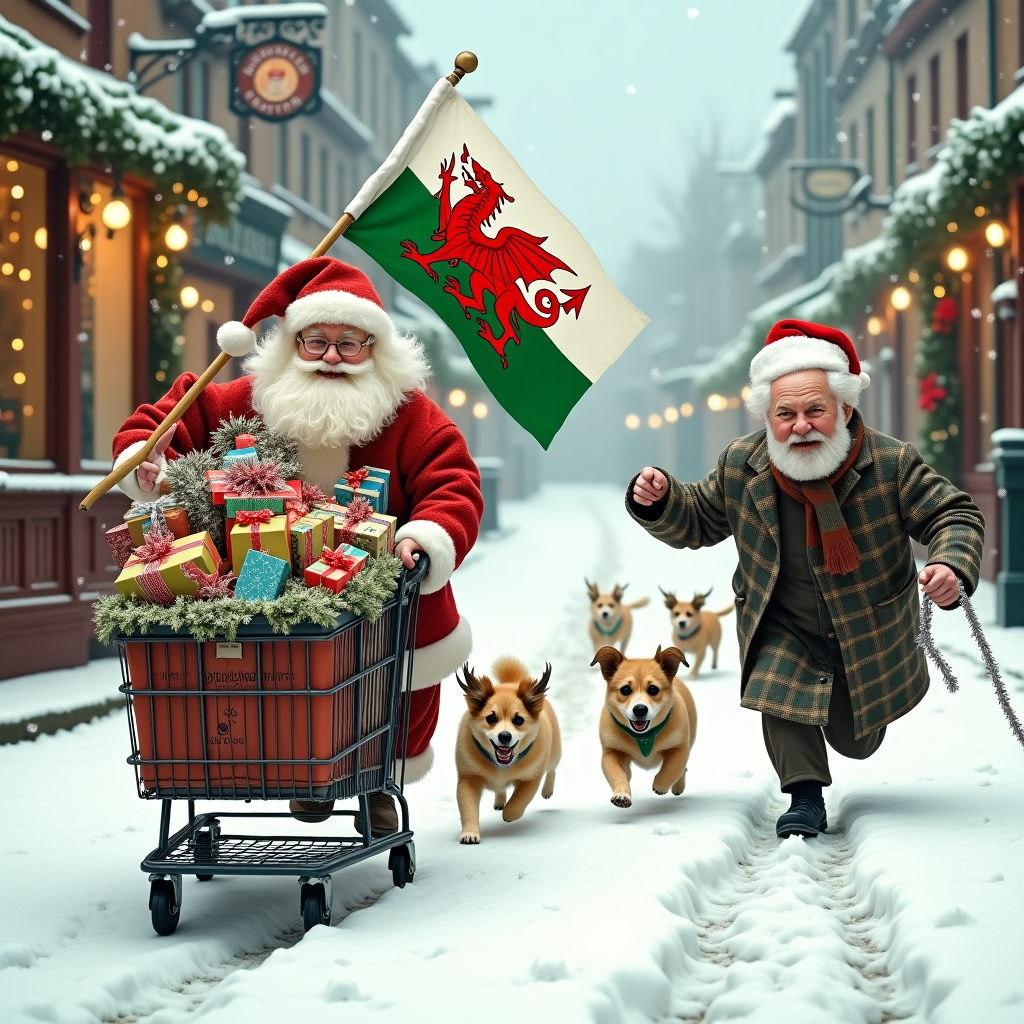 In this whimsical and bustling Christmas scene, imagine a snowy, small-town street bustling with holiday excitement. At the center, there's a jolly Santa Claus, unmistakable in his red suit and white beard, energetically pushing a shopping trolley overflowing with an eclectic mix of gifts and holiday cheer. Among the items, prominently sticking out, is a large Welsh flag draped over a mountain of colorful presents, showcasing a bright red dragon proudly flapping against a green and white background. The trolley wheels leave light tracks in the freshly fallen snow, hinting at Santa's brisk pace. To the right of Santa, an elderly gentleman with a thick head of white hair and a long woolen scarf is sprinting comically, trying to keep his hat from flying off. His plaid overcoat flutters wildly behind him as he is hilariously pursued by a group of small, playful dogs, each yapping with enthusiasm. The dogs, a mix of breeds, are adorned with tiny, festive antlers, and one cheeky pup has snagged a strand of tinsel, trailing behind like a shimmering tail. The background is filled with quaint shops adorned with twinkling lights and festive garlands, with snowflakes gently falling, creating a picturesque holiday setting. This chaotic yet heartwarming scene captures the humorous essence of holiday spirit and togetherness.
