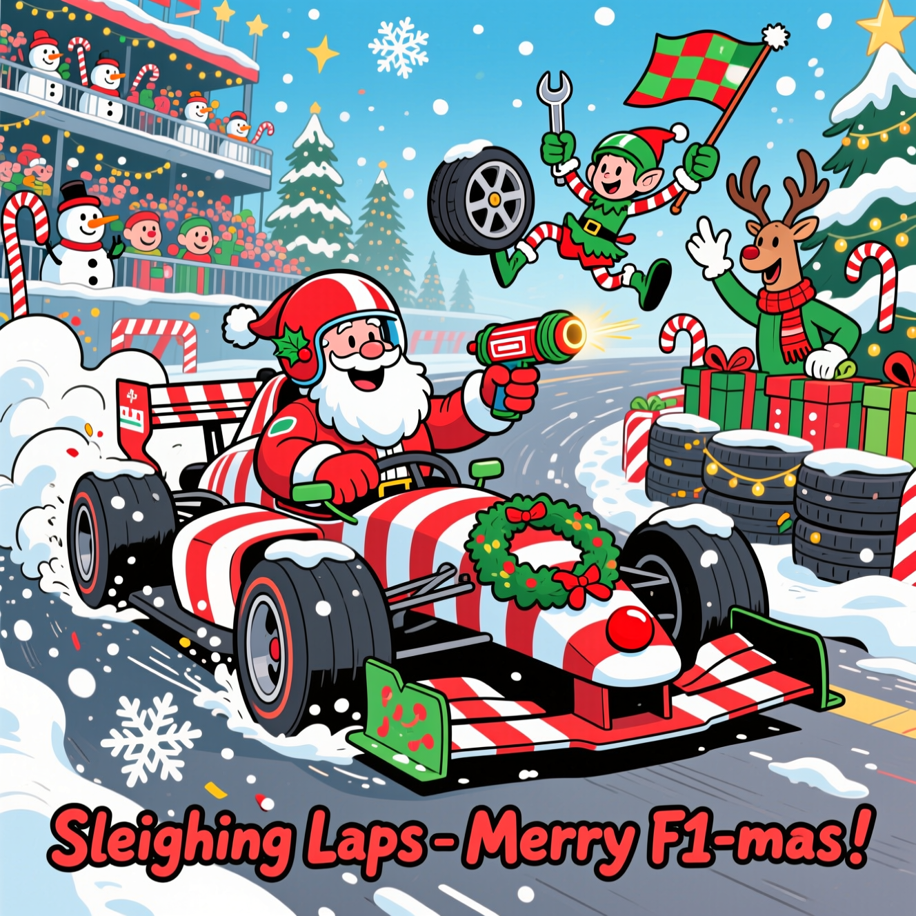 Playful, funny Christmas cartoon in bright saturated colors with thick black outlines and exaggerated proportions. Santa, chunky and grinning in a red-and-white racing suit and glossy helmet with a holly sprig, drift-races a candy-cane–striped formula-style open-wheel car through a snowy chicane; oversized tires kick up sparkling snow, tinsel flutters, a wreath hugs the front wing, and a glowing red nose sits on the nosecone. Hyper-energetic elf pit crew in oversized mittens and helmets leap and pose with peppermint-pattern wheel guns and candy-cane wrenches; one elf midair juggling a gift-wrapped spare wheel. Reindeer marshals in scarves wave a red-and-green checkered flag. Grandstands packed with cheering snowmen, candy-cane safety barriers, stacks of present-box “tyres,” twinkling fairy lights on pine trees, big fluffy falling snowflakes, starbursts, and whoosh lines; exhaust puffs shaped like snowflakes. Low 3/4 dynamic angle with a slight fisheye, crisp winter sunlight, clean cel shading. No real-world logos or extra text. Include a small, single-line, hand-lettered caption at the bottom in bold, bouncy letters with a thick outline: "Sleighing Laps—Merry F1-mas!"