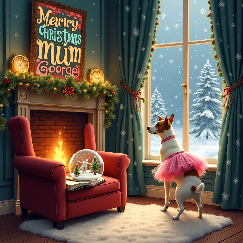 Generated with these themes: Jack Russel dog wearing a tutu, Ballet dancers performing swan lake, Banner with Merry Christmas Mum and George, and Jack Russel sat by fireside watching swan lake in snow globe.