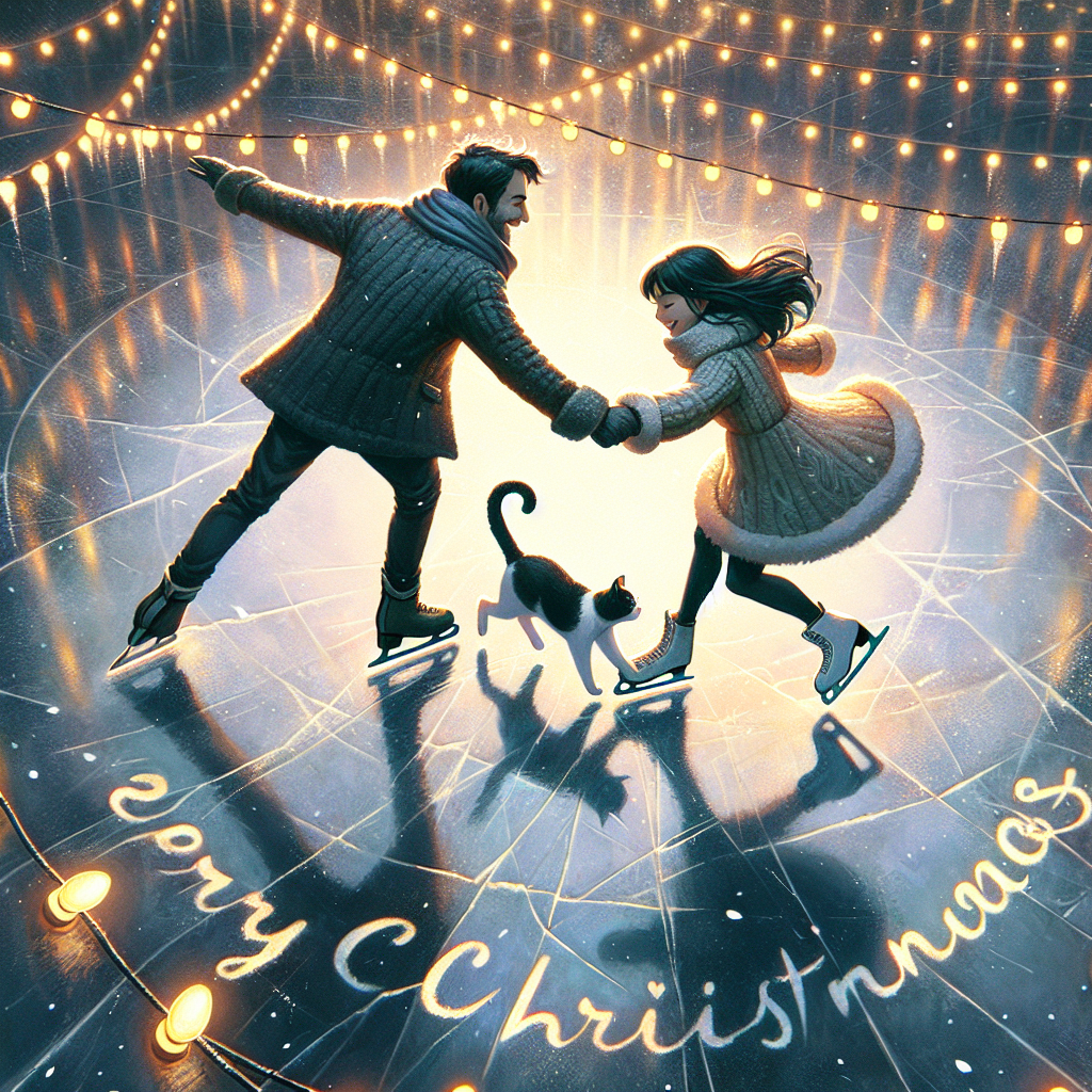 This illustration captures a couple holding hands, ice-skating on a frozen pond with their cat playfully chasing after them. String lights hang above and reflect on the ice, with 'Merry Christmas' subtly incorporated into the design of the skating rink's border.