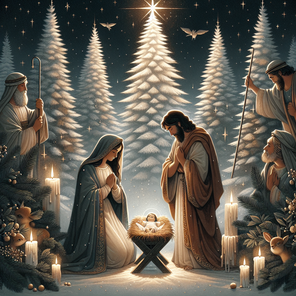 A heartwarming Christmas themed illustration showcases the Nativity scene at the center, with Baby Jesus in a manger, Mary, and Joseph. Surrounding the serene Nativity are tall, resplendent evergreen trees lightly dusted with snow, capturing the essence of an Albero di Natale. Flickering gently around the scene are numerous candles, their warm glow adding a touch of magic and spreading a message of peace and hope.
