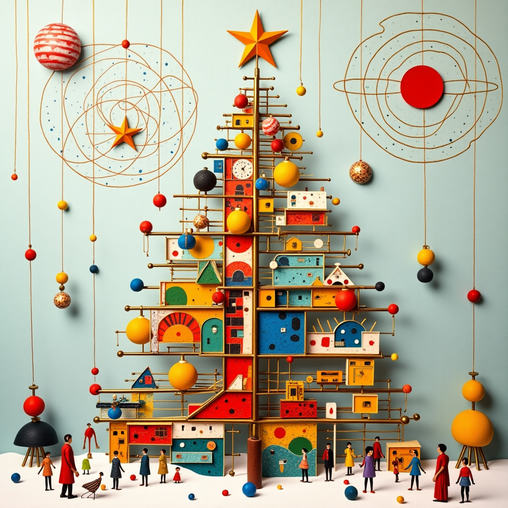 The tree’s ornaments are miniature architectural models—tiny Bauhaus buildings, Guggenheim spirals, and Le Corbusier-inspired cubes—hanging delicately from invisible threads. Atop the tree sits a shining star that looks more like a Rothko canvas, a soft gradient of reds and oranges that glows warmly. Surrounding the tree are abstract figures, playful, bulbous shapes painted in bold strokes à la de Kooning, who are seemingly in mid-dance, celebrating in their own unique forms.