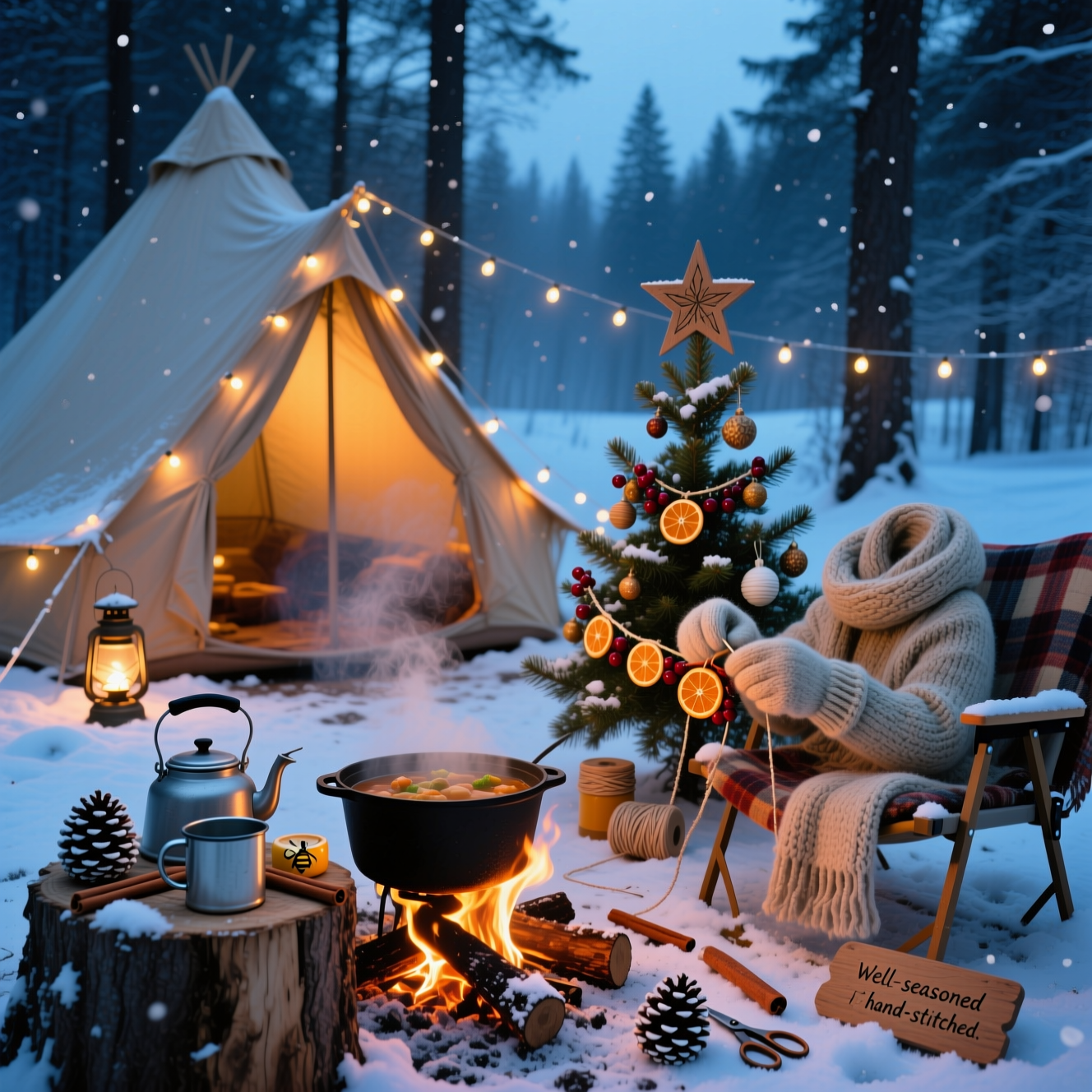 Ultra-high-definition 4K UHD, true-to-life winter campsite at blue hour in a snow-dusted pine forest, sincere and quietly joyful. A cozy canvas bell tent glows from within, warm fairy lights strung along the guy lines. In the foreground, a crackling campfire; a cast-iron Dutch oven gently simmering stew with visible steam, an enamel kettle, and two tin mugs set on a log. A rustic stump doubles as a craft table: wool-mittened hands thread dried orange slices and cranberries into a garland, a spool of twine, pinecones brushed with white paint, cinnamon sticks, tiny scissors, a little jar of beeswax, and a wooden star being carefully whittled. A half-knit scarf and needles rest on a camp chair draped with a plaid blanket. Beside the tent, a small spruce is decorated with these handmade ornaments and topped with the carved wooden star. Fresh snow falls lightly; soft footprints ring the scene; faint breath and smoke drift into the cold evening.