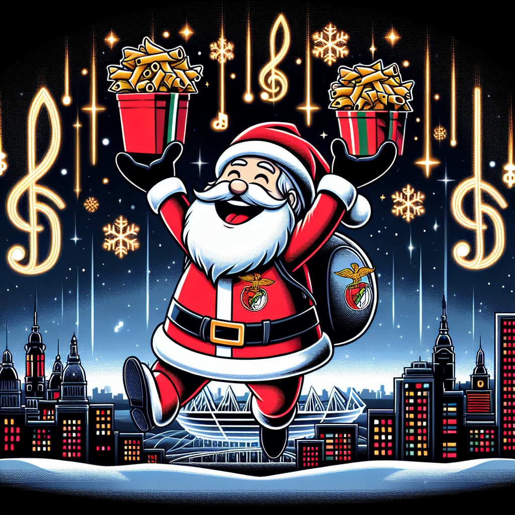 Vector image of a Benfica-themed Santa Claus dropping pasta-shaped presents over Lisbon's skyline with techno music symbols illuminating the sky like stars, all set against a Yuletide backdrop.
