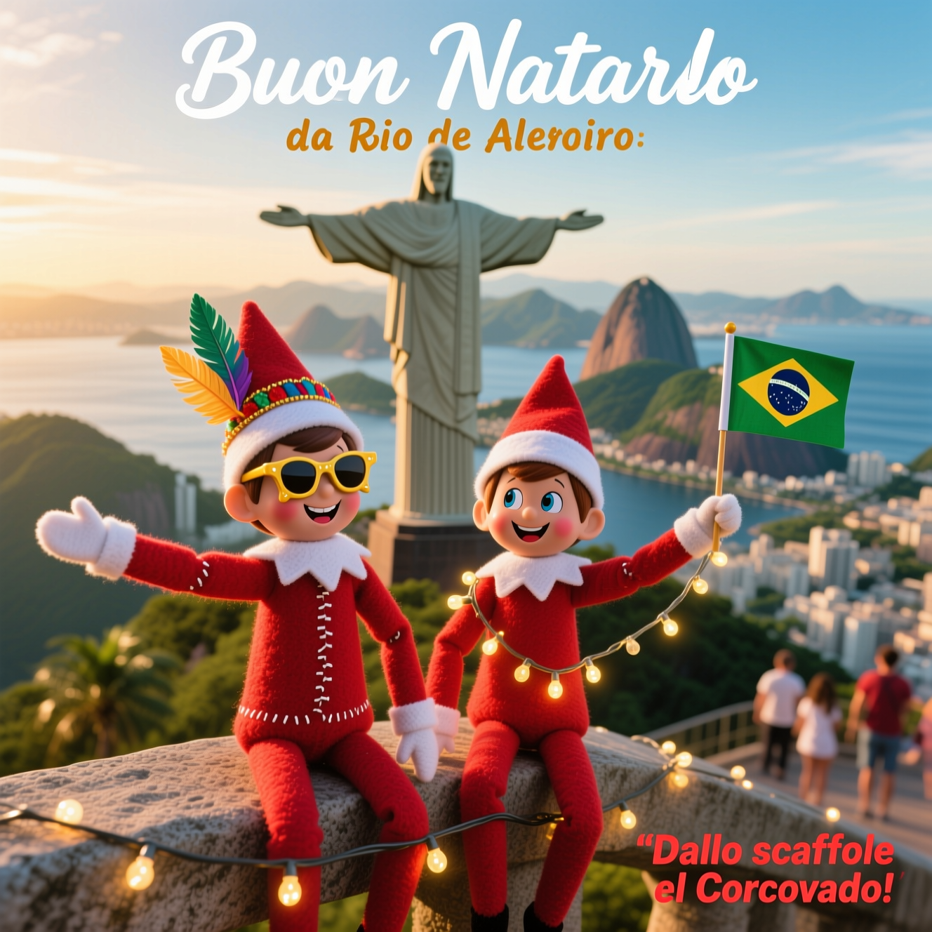 Generated with these themes: Due elfi di elf on the shelf con la statua del cristo redentore in Brasile, and .