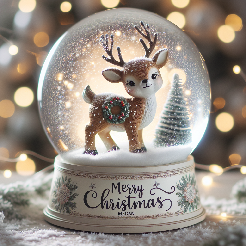 A cozy snow globe scene with a cute reindeer inside, surrounded by soft snowflakes and twinkling lights. On the reindeer's hip, discernible through the glass, is a festive tattoo with Megan's name encircled by a wreath. Above the globe, in a cheerful cursive font, reads 'Merry Christmas Megan'.