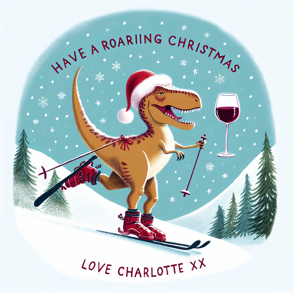 A whimsical illustration depicts a jovial T-rex gracefully skiing down a snowy hill, wearing a festive Christmas hat. In its claw-like hand, it carefully balances a glass of red wine without spilling a drop. Above the merry scene, the text 'Have a roaring Christmas. Love Charlotte xx' is written in cheerful, bold lettering, adding a personal touch to the Christmas theme.