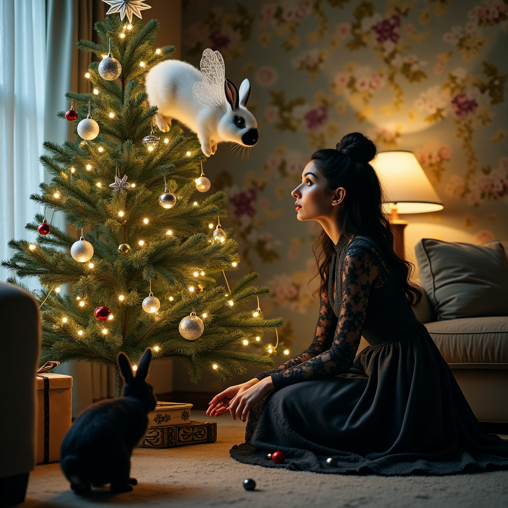 In this surreal Christmas greeting card scene, an eccentric winter wonderland unfolds within a quaint, dimly lit living room. Dominating the center is a towering, ornately decorated Christmas tree with glittering ornaments and twinkling fairy lights. Perched amid the lush branches is a whimsical white rabbit with a striking black snout, its delicate fairy wings shimmering iridescently as they catch the tree's twinkling lights. Below, a young Gothic woman, clad in a flowing, dark lace dress with intricate silver detailing, gazes intently at the rabbit, her alabaster skin accentuated by the warm glow of the tree's lights. Her eyes are wide with wonder and curiosity, framed by a cascade of jet-black hair that spills over her shoulders. On the plush carpeted floor beneath them, a playful black bunny with a white snout energetically hops about, occasionally nudging a stray, brightly colored ornament across the floor. To the side, against a richly textured wallpaper with vintage floral patterns, a mischievous black mini lop rabbit has been caught in the act of nibbling away at the paper, creating a trail of delicate curls on the floor. The scene is encapsulated in an atmosphere where whimsy and gothic elegance intertwine, capturing a moment that tells a story of enchantment, curiosity, and playful rebellion.