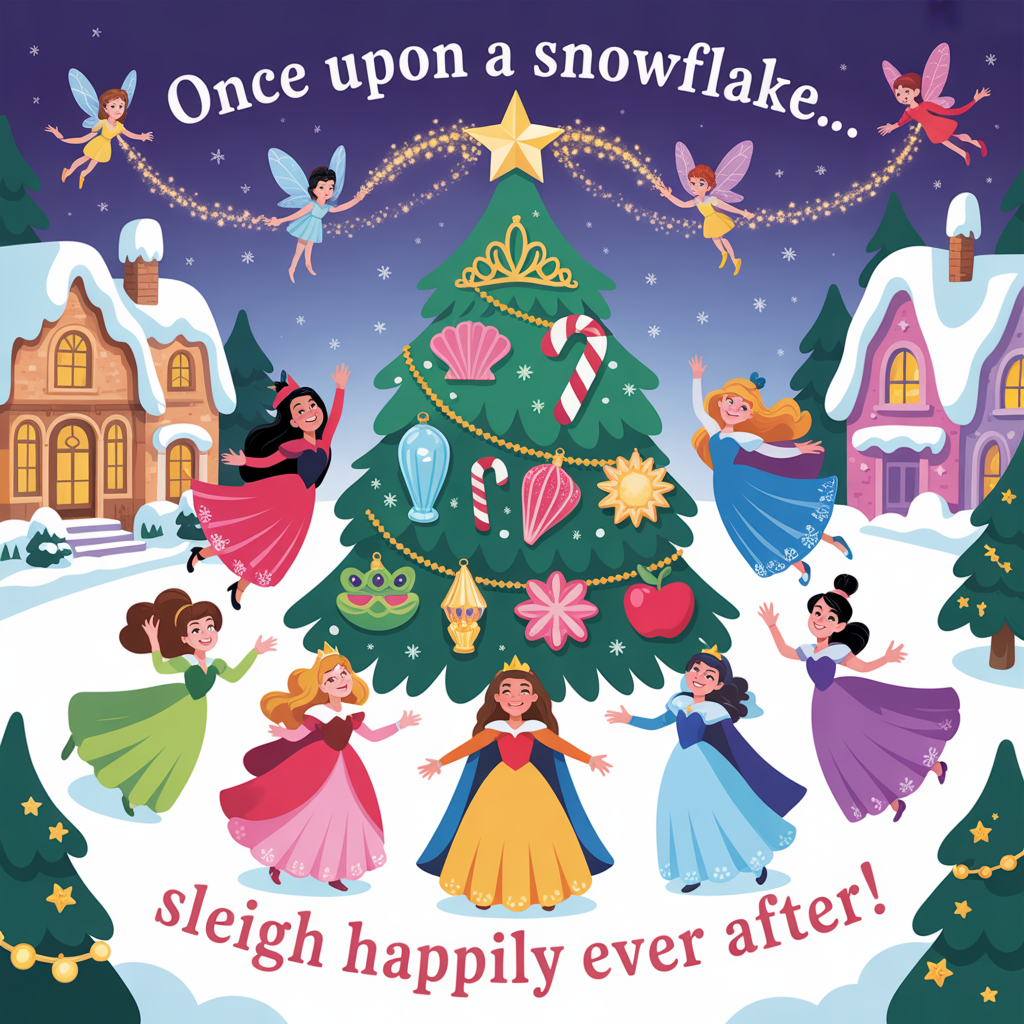 - Around the tree: a diverse circle of Disney-style princesses in cozy winter ball gowns and capes, twirling, waving, and laughing; oversized eyes, rosy cheeks, swooshy skirts, exaggerated proportions.
