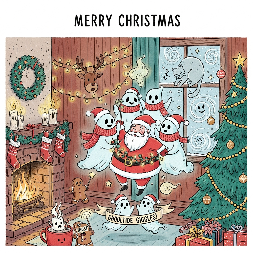 A cozy Christmas Eve living room meets the supernatural, hand-drawn with fine linework and textured brush strokes. Balanced composition: left—crackling fireplace with stockings and candles; center—jolly Santa gently levitated by smiling, translucent ghosts in knitted scarves and Santa hats as they help him hang a glowing garland; right—a slightly haunted Christmas tree whose baubles slowly orbit and tinsel floats in loops. Warm, expressive color palette: cinnamon reds, pine greens, candlelight golds, with frosty teal ghost-glow; visible paper grain and playful ink hatching. Comedic details: a marshmallow poltergeist peeks from a steaming cocoa mug, a gingerbread cookie “ghost-hunting” with a candy-cane EMF wand, a reindeer head cheerfully phases through the wall tangled in fairy lights, and a spectral cat naps midair batting at a drifting bauble. Outside the frosty window, swirling snow forms faint smiley faces. Cozy hearth light mixes with soft ectoplasmic halos and starry dust motes for a magical, funny mood; no photorealism.