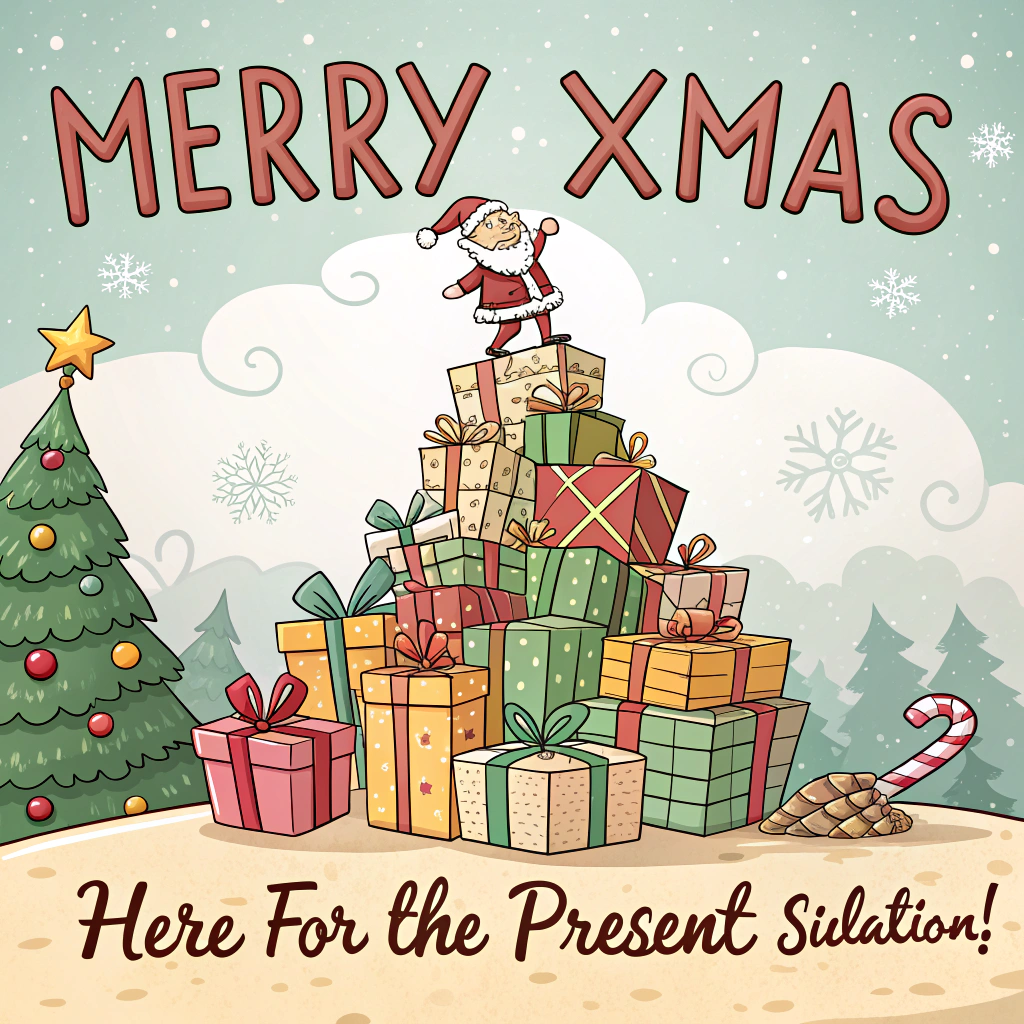 - Bottom punchline on a big dangling gift tag near the base of the pile, bold and legible.