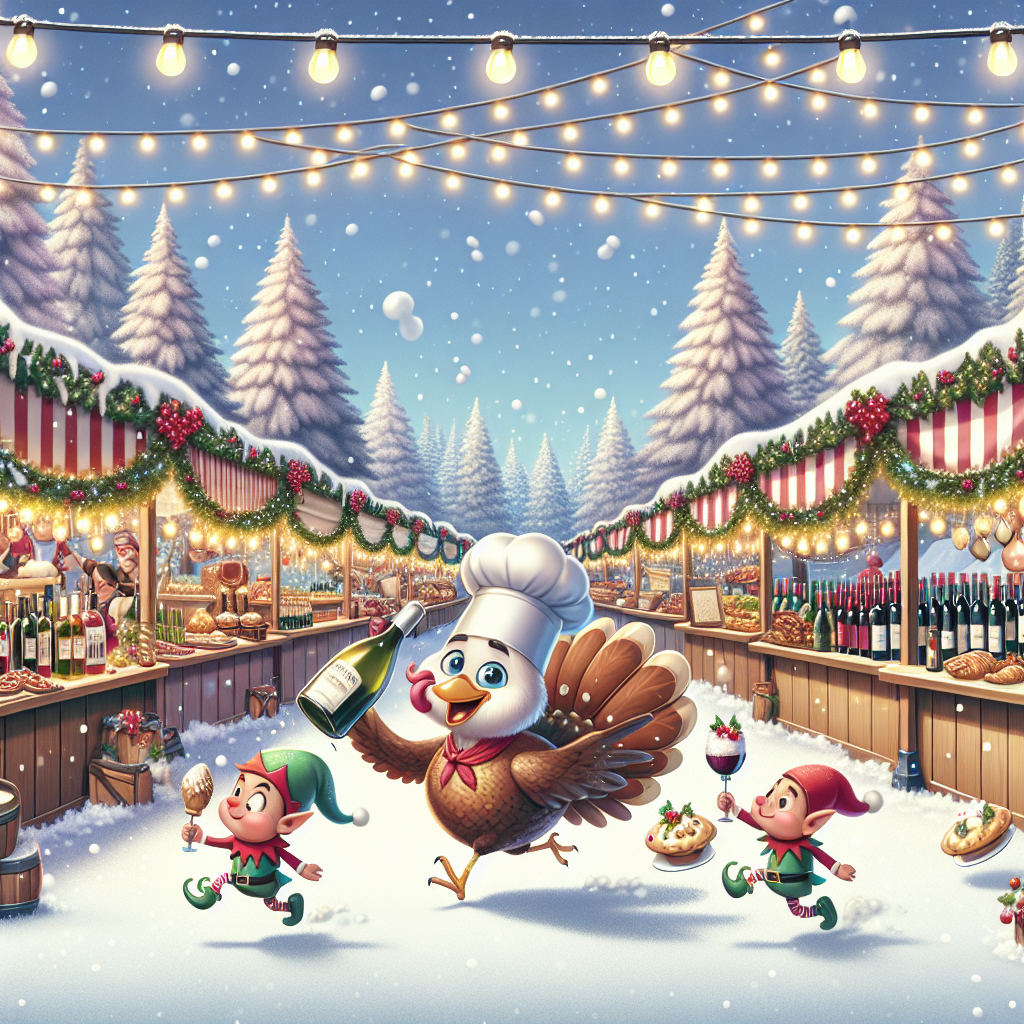 The second variation showcases an outdoor Christmas market bustling with cartoon caricatures. Stalls adorned with twinkling lights and holly sell a variety of festive wines and gourmet food. A boisterous, animated turkey, wearing a chef's hat, playfully chases a bottle of wine trying to 'escape' on little cartoon legs. Meanwhile, elves juggle mince pies and candy canes, adding a playful frivolity to the scene, which is framed by snow-covered pine trees and a sky filled with soft, fluffy snowflakes.