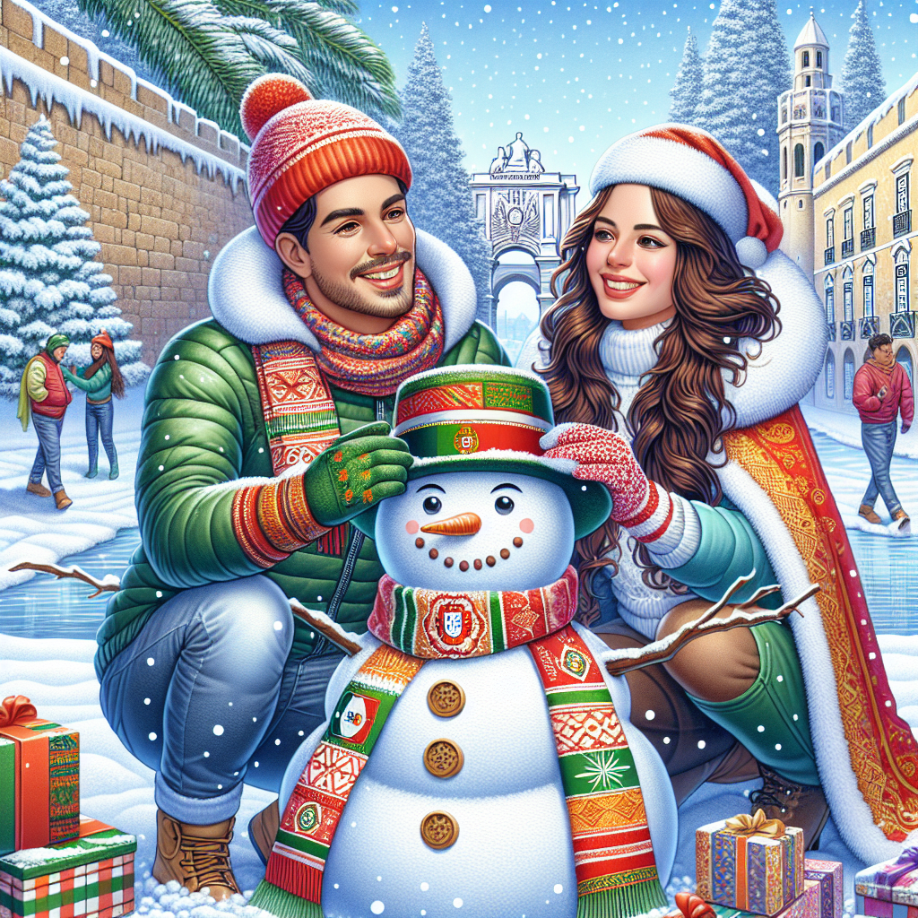 The illustration depicts a boyfriend and girlfriend building a snowman together, adorning it with colors inspired by the Portuguese and Cypriot flags. The serene Christmas setting is enhanced by a backdrop of snowy Lisbon streets and Nicosia's ancient walls.
