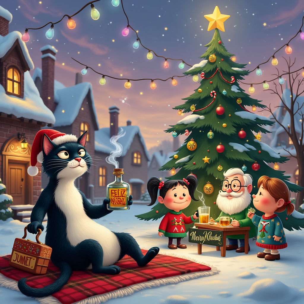 To the left of the Christmas tree, a black and white tabby cat named Whiskers lounges on a giant red and green plaid blanket. Whiskers is anthropomorphized, sitting upright with a relaxed, almost nonchalant posture. He wears a Santa hat jauntily tilted to one side and has a playful, mischievous glint in his eyes. Whiskers is holding a small, intricately designed handbag in one paw, and in the other paw, he holds a joint of marijuana with a curl of smoke wafting up in the shape of a Christmas tree. Next to him, a bottle of tequila rests in the snow, with a label that reads "Feliz Navidad Tequila" and a small glass beside it filled with a golden liquid and a slice of lime on the rim.