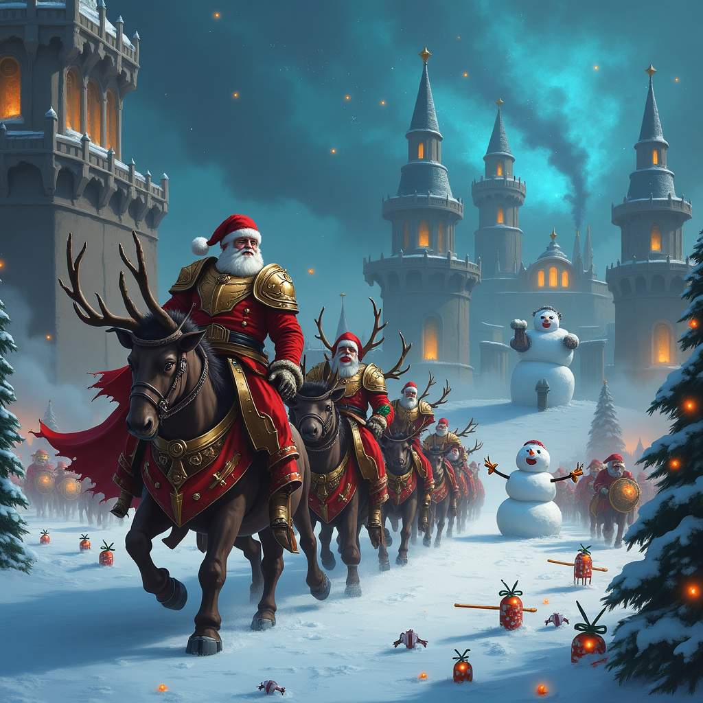 Behind Santa, towering over the snowy terrain, are massive Gothic-style structures, reminiscent of Warhammer architecture, bristling with gargoyles and fortified battlements. Each structure is lit by flickering, luminescent Christmas lights, casting eerie shadows that dance across the snow. Tiny squads of elves in battle armor, carrying candy cane lances and gingerbread shields, march alongside, their expressions both determined and merry.